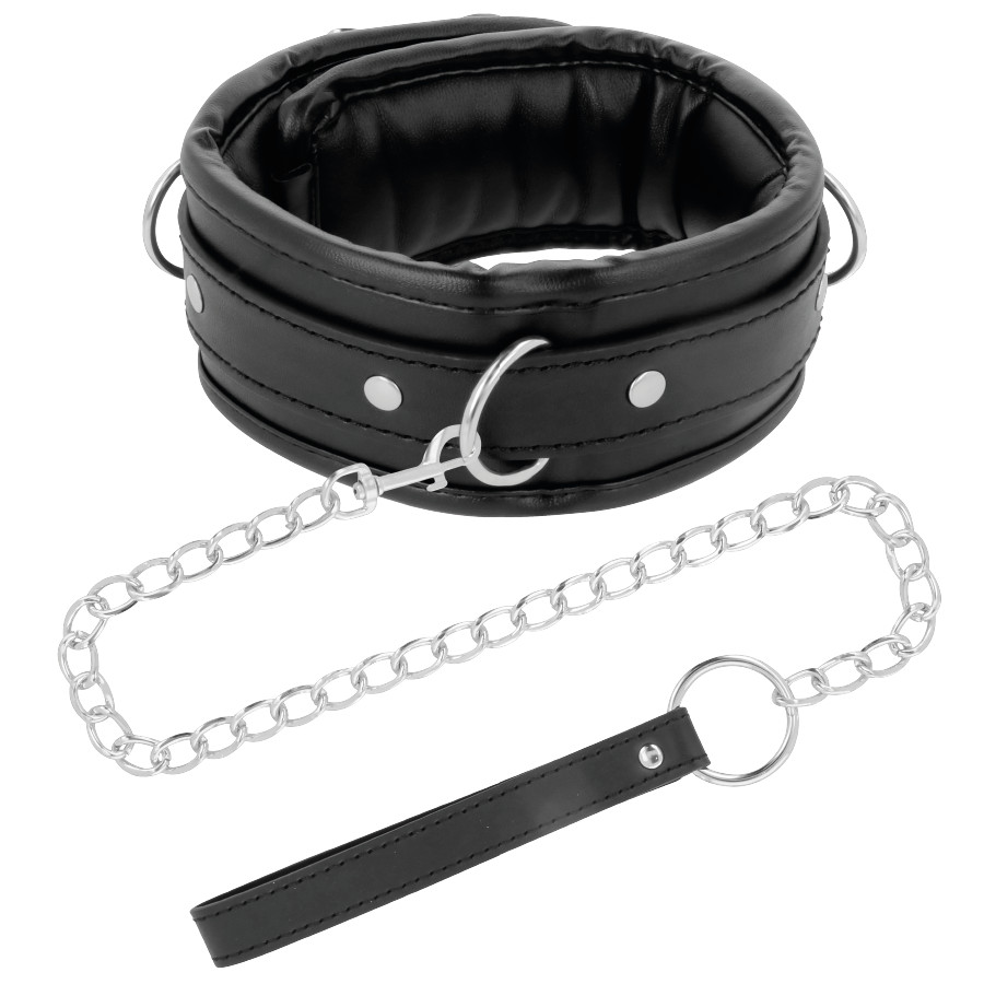 A DARKNESS párnázott bőr nyakörv láncos pórázzal ideális választás mindazok számára, akik egy kényelmes, megbízható és esztétikus nyakörvet keresnek BDSM játékokhoz.