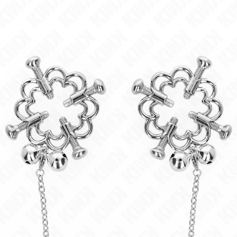 A KINK fém virágmintás mellcsipesz dekoratív kialakításával és pontosan állítható szorításával kiegyensúlyozott élményt nyújt irányítás és megjelenés között. Az ezüst színű fém csipeszeket összekötő lánc nemcsak látványos kiegészítő, hanem a használat során is további lehetőségeket kínál. ⭐ Virágmintás fém mellcsipeszek ⭐ Állítható szorítás egyéni igényekhez ⭐ Dekoratív, funkcionális fém lánc ⭐ Nikkelmentes, bőrbarát fém ⭐ Stabil, rugós kialakítás ⭐ Könnyen tisztítható felület