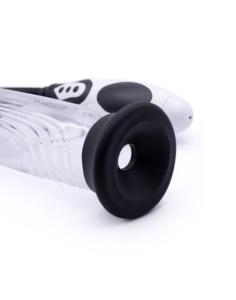 A RIMBA P-PUMP – Távirányítós vákuumpumpa hüvely betéttel távirányítóval működik, így a szívóhatás kényelmesen, egy gombnyomással szabályozható. USB-ről tölthető akkumulátora megbízható működést biztosít, a fekete–átlátszó dizájn pedig letisztult, modern külsőt kölcsönöz az eszköznek. A henger puha szilikon mandzsettával rendelkezik, amely kényelmes illeszkedést és stabil használatot biztosít.